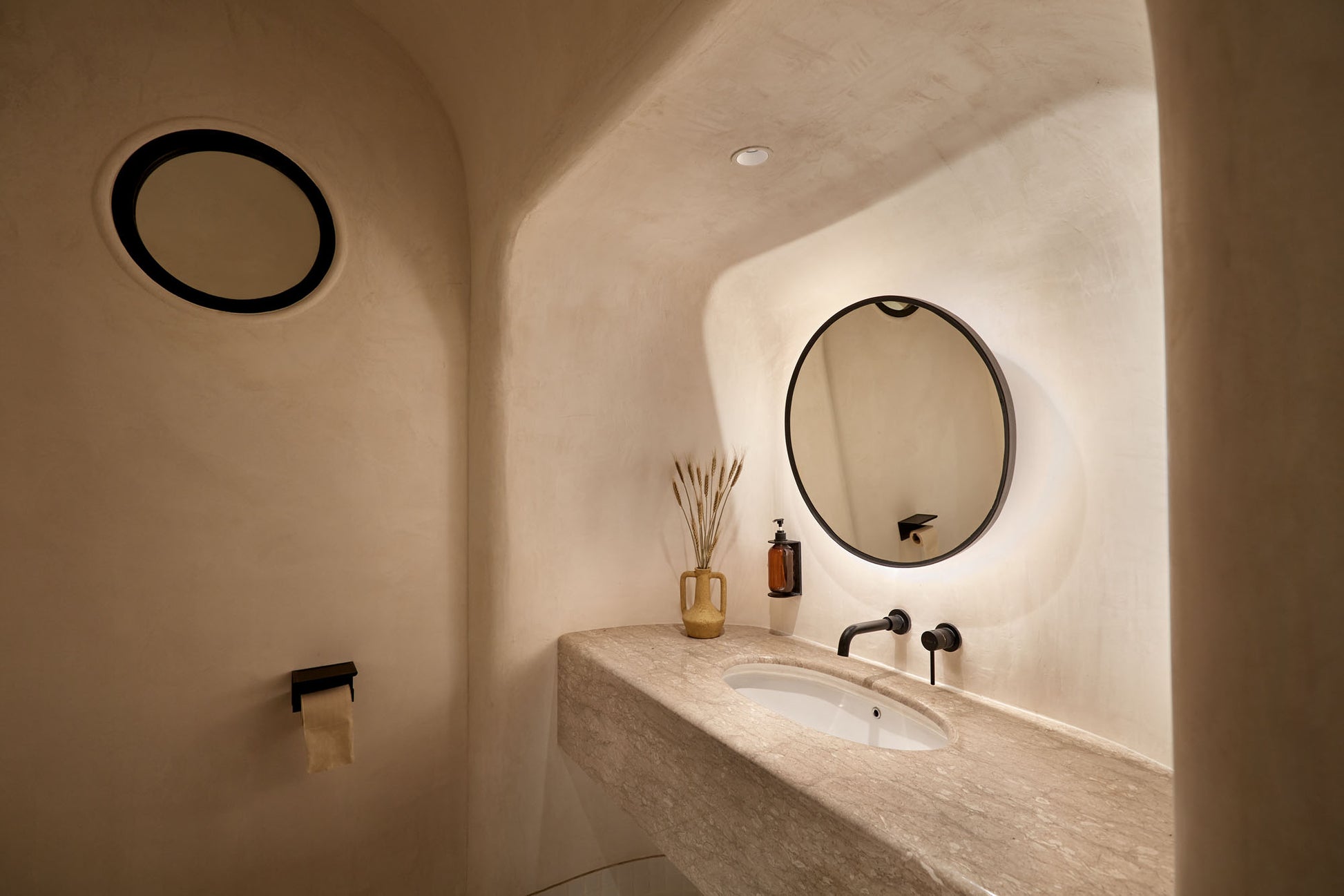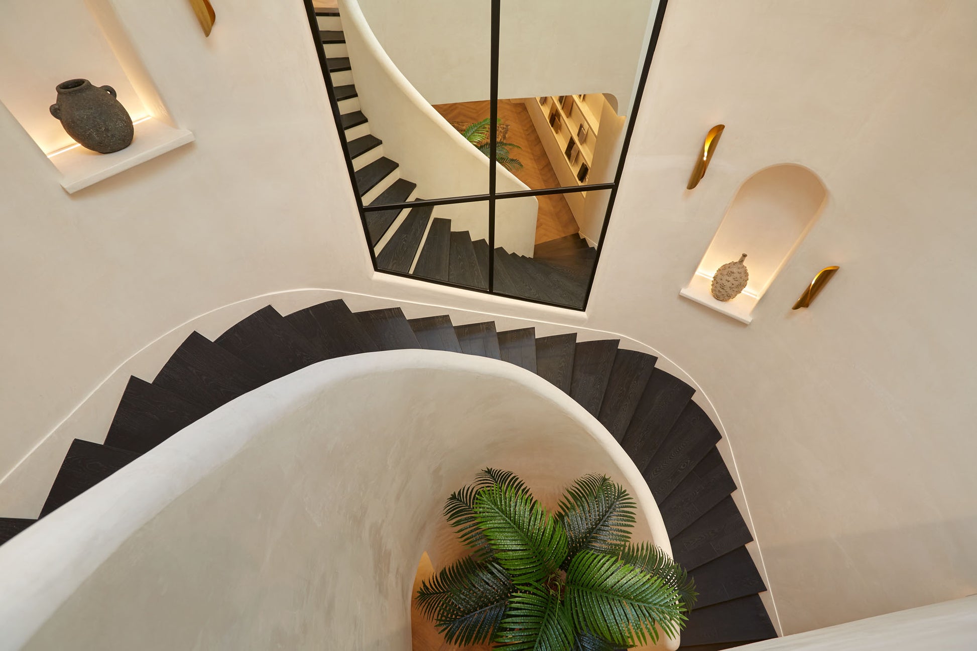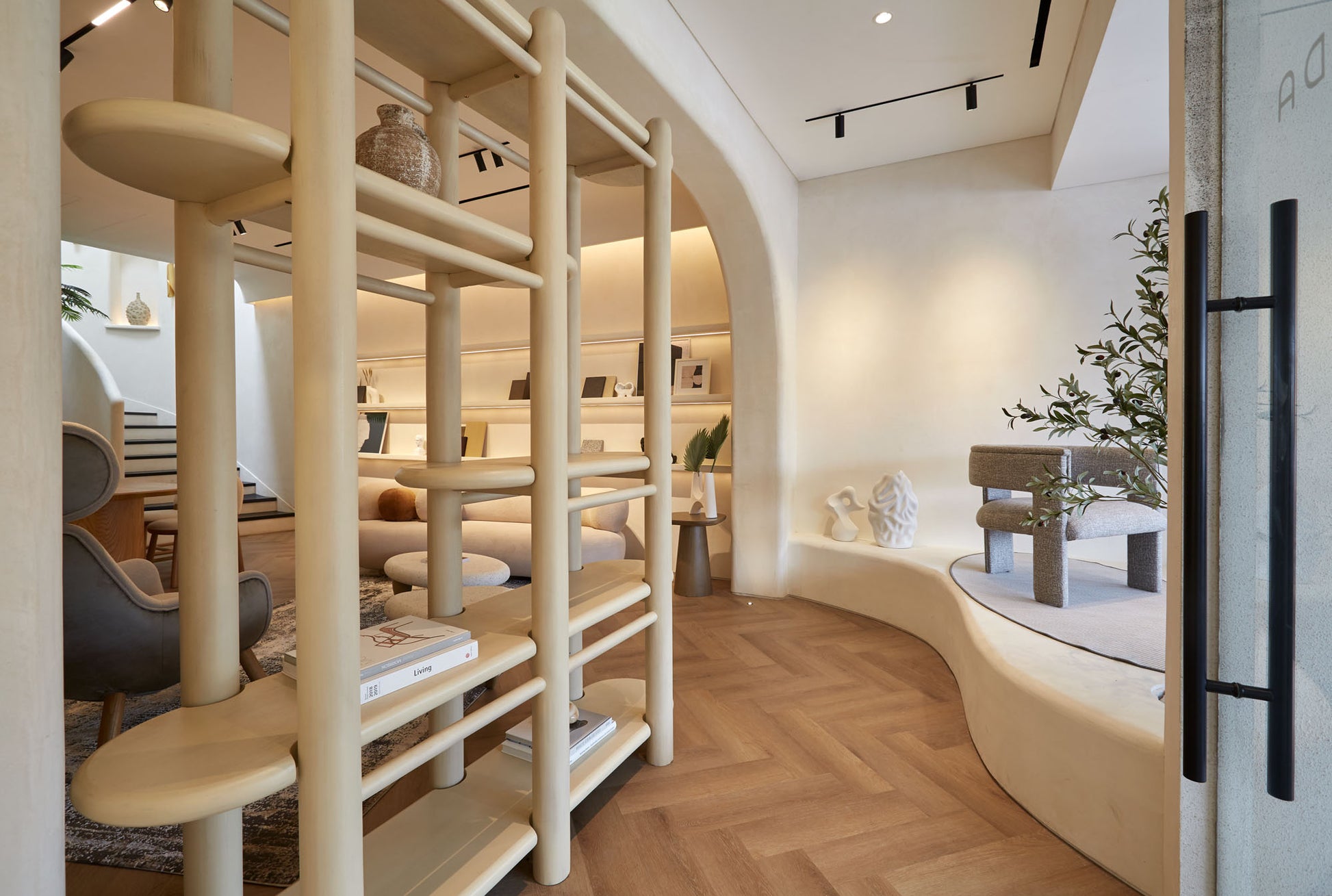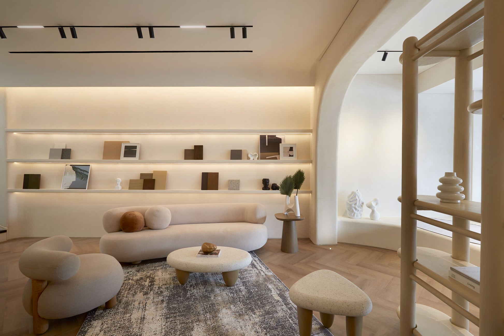At the heart of the showroom stands our favorite feature—the cascading spiral staircase. With its elegant curves, subtle niches, and black wooden steps, it offers a sculptural yet understated statement.