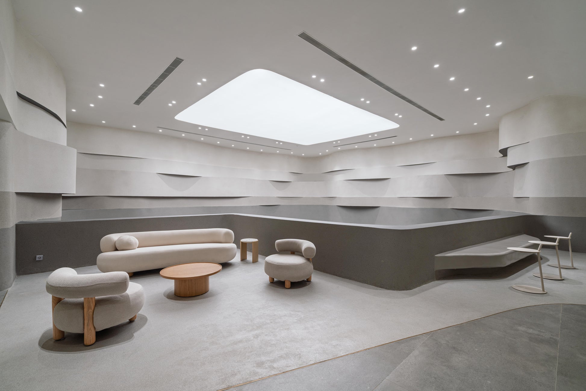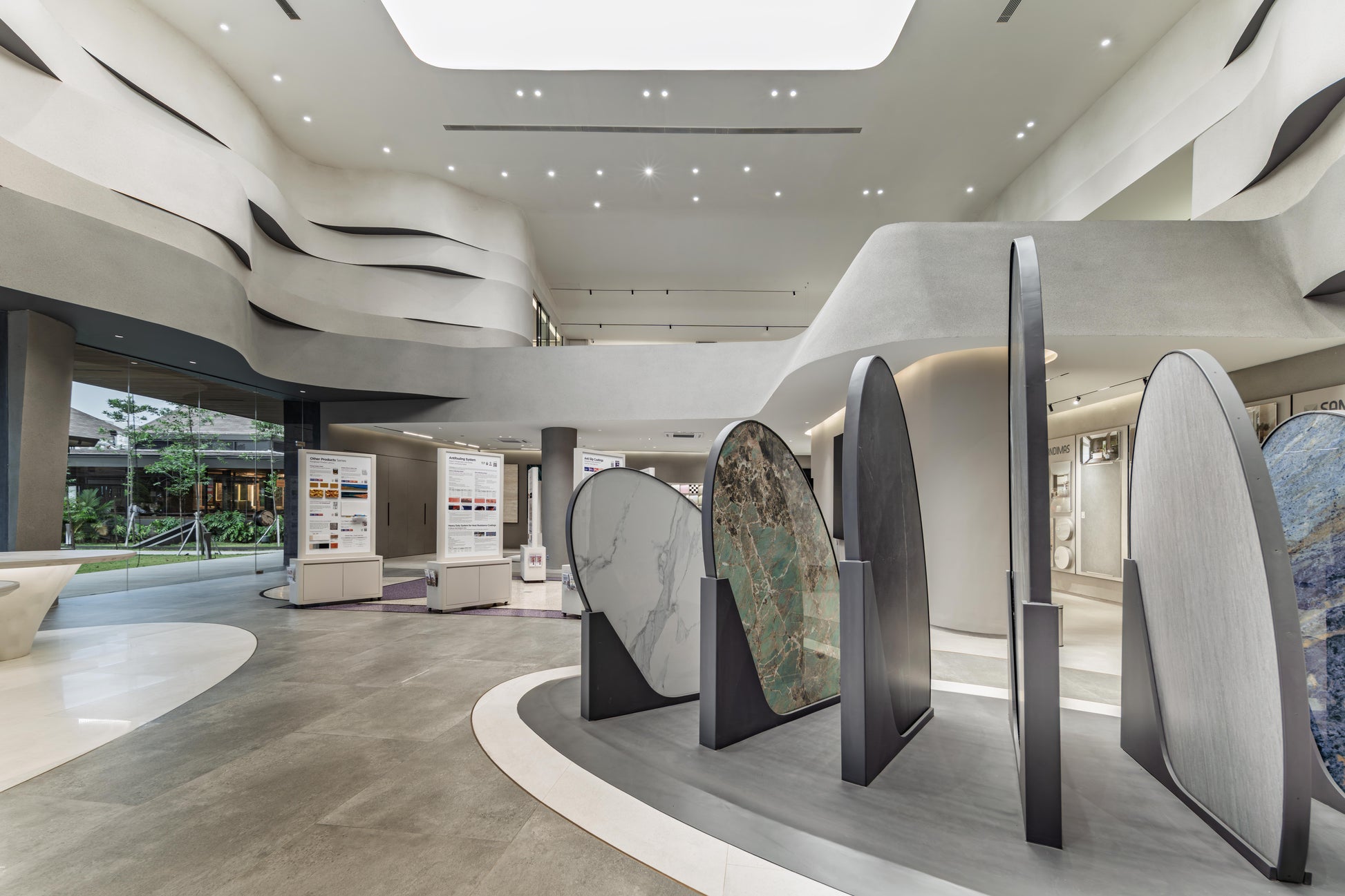 This project is a collaborative showroom by Propan Paint and Sandimas Tiles, located at Indonesia Design District, PIK 2, North Jakarta. Conceived as a space for innovation and exploration, the showroom presents the extensive range of products from both brands through thoughtful experimentation with materiality, finishes, and real-scale applications. State-of-the-art lighting is carefully integrated to accurately showcase colors, textures, and surface qualities, while the interior is designed as a clean, neutral canvas that allows the materials to be read with clarity. Fluid architectural lines are introduced throughout the space, representing the versatility and adaptability of the materials across various applications, as well as both brands’ continuous pursuit of innovation. Together, these elements create an immersive environment where visitors can experience the products firsthand, understand their performance within spatial contexts, and draw inspiration to confidently apply them in their own architectural and interior projects.